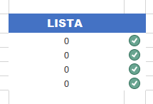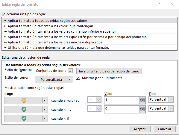 En este caso, tengo una tabla donde los valores son introducidos en la filas de la columna F y en las filas de la columna G tiene aplicado el formato condicional de iconos teniendo como objetivo mostrar el icono "✓" cuando los valores son iguales a cero y el icono "!" si los valores son mayores a 0.