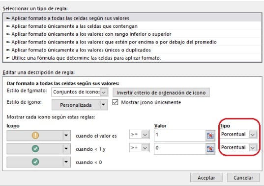 Esta vez estoy tratando de hacer una tabla que dependiendo del valor en sus celdas muestre un símbolo diferente por medio del formato condicional de iconos.