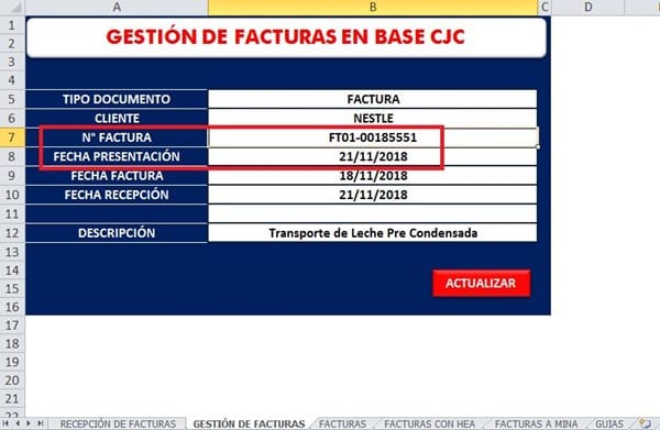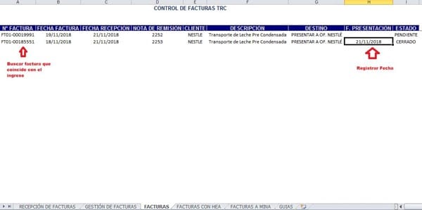 Necesito una macro que me pueda registrarla fecha de Presentación (celda B8) de un determinado N° de Factura (celda B7)de la hoja “GESTIÓN DE FACTURAS” a la hoja “FACTURAS”, en dicha hoja "FACTURAS" hay varias facturas que han sido registradas previamente y deberá buscar el N° de Factura (columna A) que coincide con la que se está registrando como presentada y que coloque sólo la fecha de presentación.(Columna H)