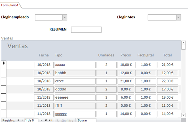Tengo una consulta que nos muestra los totales de euros que un empleado genera por tipo de producto. Lo que me gustaría que apareciera en algún campo de texto o algo similar el total de euros del mes y de todos los productos.