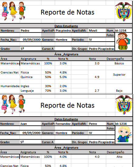Lo que no logro es dar formato al reporte para que me imprima cada uno de los estudiantes en el orden que corresponda y además poder sacar las notas y desempeños de los mismos según el área