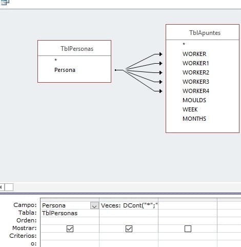 Veces: DCont("*";"TblApuntes";"WORKER = '" & [Persona] & "'")+DCont("*";"TblApuntes";"WORKER1 = '" & [Persona] & "'")+DCont("*";"TblApuntes";"WORKER2 = '" & [Persona] & "'")+DCont("*";"TblApuntes";"WORKER3 = '" & [Persona] & "'")+DCont("*";"TblApuntes";"WORKER4 = '" & [Persona] & "'")
