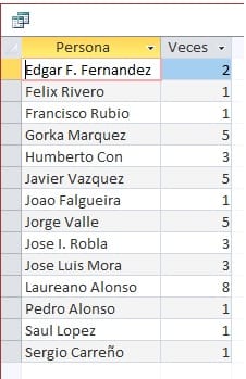 buenas, muchas gracias Jacinto por la sugerencia, mas arriba está la imagen con las cuatro columnas de trabajadores que se repiten, lo que me gustaría es hacer una consulta en la que me contara cada uno de los trabajadores para luego hacer una gráfica de las veces que aparecen y filtrarlo por semanas, espero esta vez haberme explicado bien para que alguien me pueda ayudar, pues no tengo conocimientos para hacerlo solo.