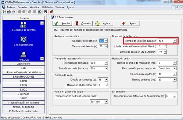 Pantalla de “Temporizadores” de la TEA 308 donde se ajusta el “tiempo de inicio de llamada”. Este es el tiempo desde que la centralita marca el número hasta que considera que la llamada ya ha sido descolgada, y por lo tanto es el momento de comenzar a tarificar. Evidentemente este es un sistema imperfecto, ya que si nadie coge la llamada y el tiempo ha sido ajustado demasiado bajo, se cobrará por una llamada que en realidad no se ha producido. Por el contrario, si colocamos un tiempo de inicio demasiado alto (50 seg) habrá llamadas salientes de corta duración que no serán tenidas en cuenta por el sistema a la hora de tarificar. La solución por tanto, detectar el momento justo en el que la llamada saliente ha sido descolgada. Y el sistema para detectarlo en las líneas analógicas es el de los cambios de polaridad.