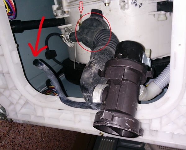 Fíjate en la circunferencia roja y la flecha que marca el tornillo a aflojar para poder sacar el desagüe de la cuba. Quizás por ahí puedas sacarlo. Si no sacando la goma de la puerta.