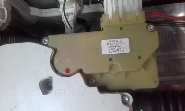 Lo blanco donde engrana el engranaje rojo entiendo que es la jabonera y es lo que debería cambiar de intentar para enviar el agua a un sitio o a otro.