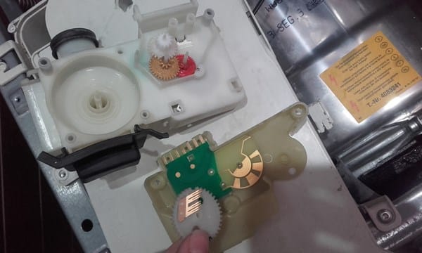 Fíjate donde están las lengüetas, y donde están los contactos, ese engranaje tiene que estar montado en la posición justa para que marque cada vez que cambia de un cajón a otro de la jabonera. Si no has marcado donde iba cada pieza antes de desmontar sera complicado dejarlo todo igual.