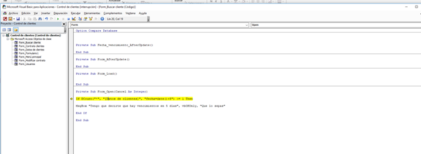 Tengo un base de datos en access, que tiene un tabla llamada Datos de clientes, dentro de esa tabla hay un campo llamado fecha vencimiento, me gustaría que cuando abra el formulario me muestre un avisos de vencimiento con una antelación de 5 días en las fechas que se encuentran dentro de fecha vencimiento.