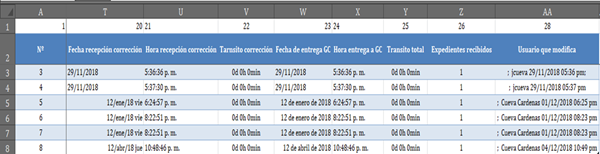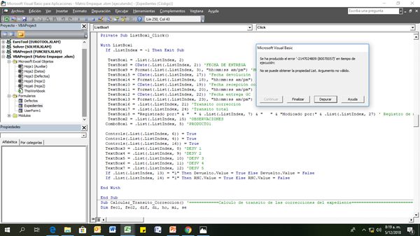 Private Sub ListBox1_Click() With ListBox1 If .ListIndex = -1 Then Exit Sub TextBox1 = .List(.ListIndex, 2) TextBox8 = CDate(.List(.ListIndex, 2)) 'FECHA DE ENTREGA TextBox9 = Format(.List(.ListIndex, 3), "hh:mm:ss am/pm") 'HORA DE ENTRGA TextBox15 = CDate(.List(.ListIndex, 17)) 'Fecha devolución TextBox14 = Format(.List(.ListIndex, 18), "hh:mm:ss am/pm") 'Hora devolución TextBox10 = CDate(.List(.ListIndex, 19)) 'Fecha recepción corrección TextBox11 = Format(.List(.ListIndex, 20), "hh:mm:ss am/pm") 'Hora recepcion corrección TextBox12 = CDate(.List(.ListIndex, 22)) 'Fecha entrega GC TextBox13 = Format(.List(.ListIndex, 23), "hh:mm:ss am/pm") 'Hora entrega GC TextBox16 = .List(.ListIndex, 21) 'Transito correccion TextBox17 = .List(.ListIndex, 24) 'Transito total TextBox18 = "Registrado por:" & " " & .List(.ListIndex, 7) & " " & "Modicado por:" & .List(.ListIndex, 27) ' Registro de modificaciones TextBox2 = .List(.ListIndex, 15) 'OBSERVACIONES ComboBox1 = .List(.ListIndex, 5) 'PRODUCTO1 Controls(.List(.ListIndex, 6)) = True Controls(.List(.ListIndex, 4)) = True Controls(.List(.ListIndex, 16)) = True TextBox3 = .List(.ListIndex, 8) 'DESV 1 TextBox4 = .List(.ListIndex, 9) 'DESV 2 TextBox5 = .List(.ListIndex, 10) 'DESV 3 TextBox6 = .List(.ListIndex, 11) 'DESV 4 TextBox7 = .List(.ListIndex, 12) 'DESV 5 If .List(.ListIndex, 13) = "1" Then Devuelto.Value = True Else Devuelto.Value = False If .List(.ListIndex, 14) = "1" Then RNC.Value = True Else RNC.Value = False End With End Sub