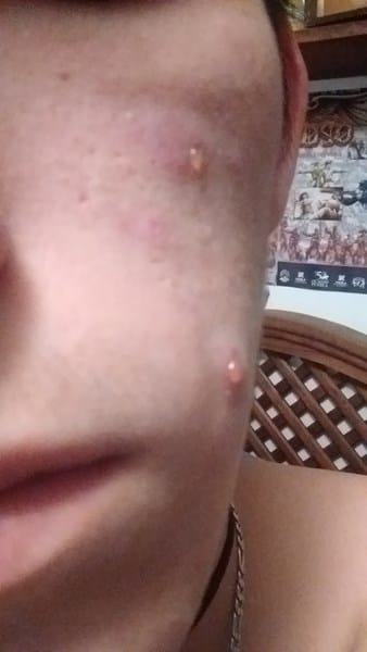 ¿Grano quístico ya reventado? Elminarlo después de seguir supurando. En la mejilla.