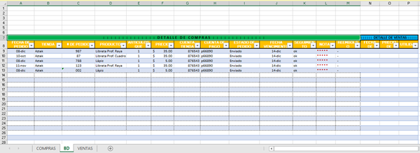 - la utilidad, columna P (la cual deberá calcular con el precio de venta menos el precio que encontró en el registro para dicho producto).