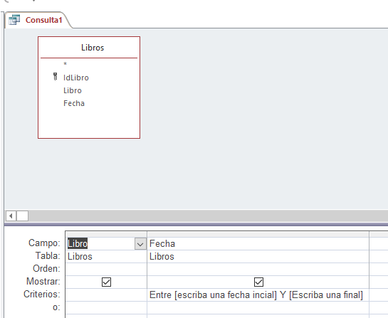 SELECT TPtmos.Libro, Count(TPtmos.Libro) AS [Ptmos periodo] FROM TPtmos WHERE (((TPtmos.Fecha) Between [Formularios]![NombreFormulario]![txtFechaInicio] And [Formularios]![NombreFormulario]![txtFechaFin])) GROUP BY TPtmos.Libro;