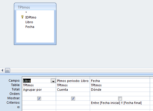 SELECT TPtmos.Libro, Count(TPtmos.Libro) AS [Ptmos periodo] FROM TPtmos WHERE (((TPtmos.Fecha) Between [Fecha inicial] And [Fecha final])) GROUP BY TPtmos.Libro;