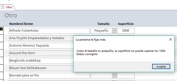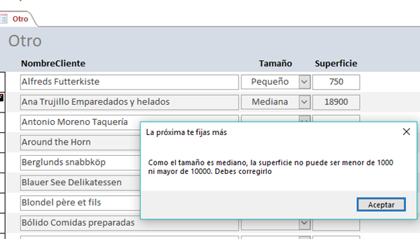 MsgBox "Como el tamaño es mediano, la superficie no puede ser menor de 1000 ni mayor de 10000. Debes corregirlo", vbOKOnly, "La próxima te fijas más"