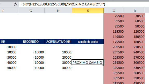 O en la columna de "cambio de aceite" después de mayor o menor (donde dice rango), anotar los valores en rojo, para no insertar uno por uno, ya que si ponga solo la columna no arroja ningún dato.