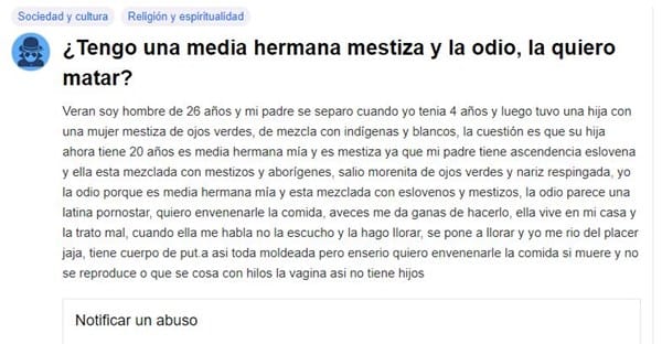 Estaba por Yahoo y vi esto (foto) intente denunciarlo con Yahoo pero me dice que hay un "error", dejo el link de la pregunta en Yahoo para poder ayudar a esa persona, no la conozco pero me generan miedo sus pensamientos psicopaticos (supongo que son psicopaticos).