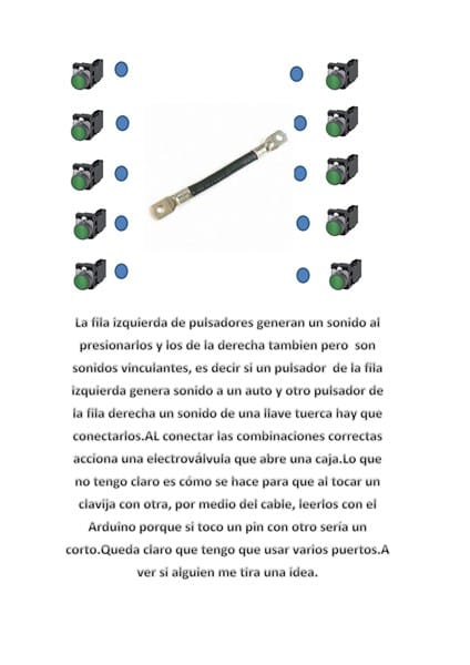 Me piden como trabajo de fin de curso hacer una especie de juego el cual tiene dos filas de 5 pulasadores cada fila:Cada pulsador tiuene asociada una clavija. Cada pulsador genera sonidos que son vinculantes, es decir un pulador hace ruido de un auto y buscando encontrás el ruido de una llave tuerca lo asocias mediante un cable que conecta las dos clavijas. Si la combinación que hiciste es correcta, activa una electroválvula. Lo que no tengo claro es como programar los dos pines que se unirían con el cable porque ¿eso no seria un corto?. Acá dejo el dibujo. Feliz año y disculpen las desprolijidades.