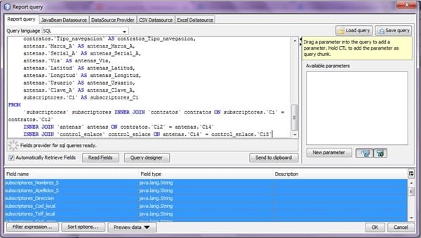 A todoexpertos estoy realizando un programa en netbeans 8.2 en lenguaje Java y tengo instalado JasperReport soy nueva en la manipulación de esta librería. Mi duda es si se puede ingresar un parámetro externo como es una variable cédula ingresada por teclado. Si la cédula existe en la base de datos que me muestre sus datos en un reporte. Solo necesito los datos que corresponden a esa cédula, ya vi que en report query del Jasper se hace la consulta pero ¿cómo ingresaría esa variable externa que proviene desde el formulario a esa consulta en el report query o existe otra manera?. En la imagen, tengo una consulta realizada pero muestra todos los registros de la base de datos