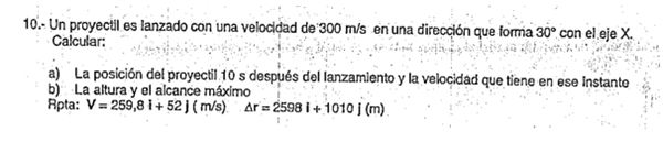 $$\begin{align}&x(t) = x_0 + v_0 \cos(\theta) t\\&v_x(t) = v_0 \cos(\theta)\\&y(t) = y_0 + v_0 sen(\theta) t - \frac{1}{2} g t^2\\&v_y(t) = v_0 sen(\theta) - g t\\&\text{Definiendo como origen de coordenadas el lugar del lanzamiento y reemplazando los datos conocidos queda:}\\&x(t) = 150 \sqrt {3} t\\&v_x(t) = 150 \sqrt {3} \\&y(t) = 150 t - 4.9 t^2\\&v_y(t) = 150 - 9.8 t\\&\text{Una vez que tenemos todas las ecuaciones es cuestión de reemplazar los datos}\\&a)\\&x(10) = 150 \sqrt {3} \cdot 10=2598m \ (en \ X)\\&y(10) = 150 \cdot 10 - 4.9 (10)^2 = 1010m \ (en \ Y)\\&\\&v_x(10) = 150 \sqrt {3} = 259.8 m/s \ (en \ X)\\&v_y(10) = 150 - 9.8 t = 52 m/s \ (en \ Y)\end{align}$$