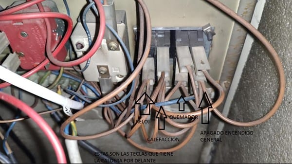 La tecla de la calefacción en encendido, he quitado una de las clemas que lleva (la que te señalo con flecha roja) y el agua caliente funciona y la calefacción no funciona