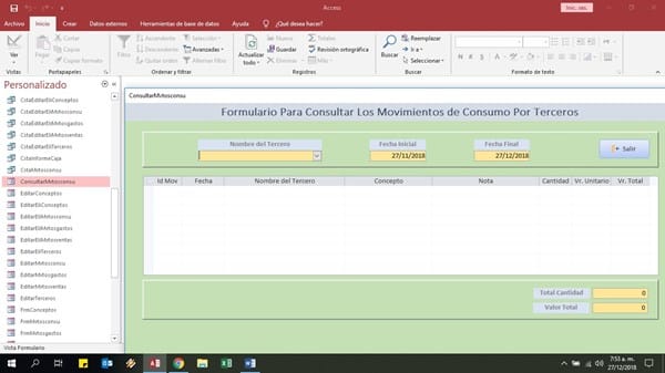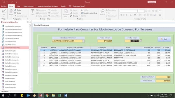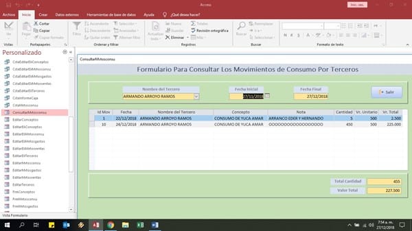En esta imagen se aprecia que al cambiar la fecha inicial, el subformulario se actualizó, pero los campos que están en la parte inferior del formulario (TxtCantidad y TxtVrtotal) no se actualizaron, continúan con 455 y 227.500. Lo correcto seria 895 y 413.500.