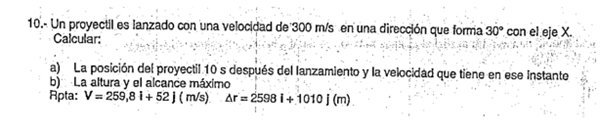 $$\begin{align}&\text{Primero hallemos en que tiempo el proyectil alcanza la máxima altura}\\&\\&V_0=150\sqrt3\\&V_1=0\\&\\&V_1=V_0-gt_1\\&\\&150\sqrt3=9.8t_1\\&\\&t_1\approx 26.5\text{ s}\\&\\&\text{Como este tiempo es menor que 10 segundos, entonces la gravedad en ese instante}\\&\text{desfavorece a la velocidad disminuyéndola, por ende }\\&\\&\bullet \text{Velocidad vertical}\\&\\&V_{y[10s]}=V_0-g(10)\\&\\&V_{y[10s]}=150-98\\&\\&V_{y[10s]}=52 ~\text{(m/s)}\\&\\&\\&\bullet\text{Velocidad horizontal}\\&\\&V_{x[10s]}=150\sqrt3 \approx 259.8 \text{ (m/s)}\\&\\&\square \text{ alcance vertical después de 10 segundos}\\&\\&h=V_{y[10s]}t+\frac{1}{2}gt^2 ~~~\textit{(se coloca el signo + por que la altura antes de los 26.5 segundos está en auge)}\\&\\&h=52\cdot 10+4.9\cdot 100\\&\\&h=520+490\\&\\&h= 1010 \text{ m}\\&\\&\square \text{ Alcance horizontal después de los 10 segundos}\\&\\&e=V_{x[10s]}t\\&\\&e=150\sqrt{3}\cdot 10\\&\\&e\approx 2598 \text{ (m)}\end{align}$$