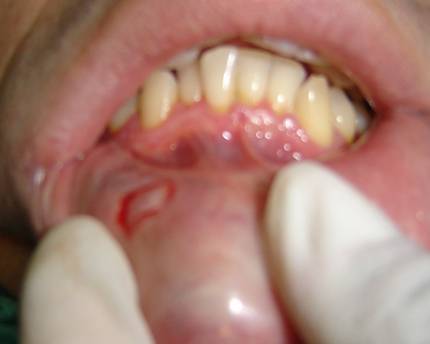 Como bien ha dicho, puede deberse también a una obstrucción/inflamación de una glándula salivar menor, aunque esta opción la desconozco en gran medida, pienso que por extensión existen una serie de problemas que son generados a patir de esta inflamación de la glándula, como por ejemplo son Mucocele