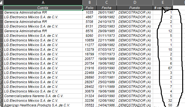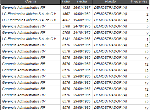 Tengo una base que viene de una consulta de SQL lo que manda es la casilla de folio pero quiero que en otra hoja me repita toda la información la cantidad de veces que lo va repetir sera el numero de vacantes en la imagen encierro la cantidad que se debe duplicar la información: