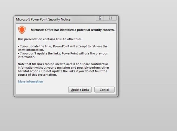 A crear una macro en excel para que seleccione todos los archivos de powerpoint presents en una carpeta los abra y de clic en Update Links, y los cierre guardado los cambios