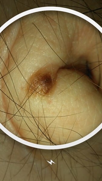 Lo tengo desde hace un tiempo pero no me había parado a verlo hasta ahora, esta en la zona del ombligo, de lado a lado mide entre 3 y 3,5 mm y es este :