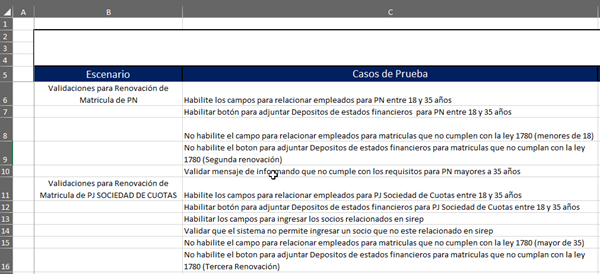 Tengo un listado donde en la columna B se encuentra el nombre de los escenarios y en la columna C se encuentra el nombre de los diferentes Casos de Prueba que se vinculan a los diferentes escenarios, necesito crear una carpeta con el nombre del escenario y que esta contenga (subcarpetas) los mobres de casos de prueba