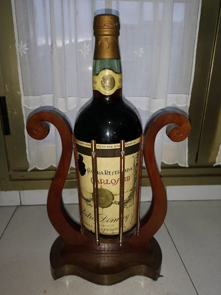 Me gustaría saber el valor de este Botellón antiguo de 2,5 litros de Carlos III (Pedro Domecq) solera reservada, con su expositor de madera en forma de lira todo en muy buen estado y su contenido intacto. La botella no trae ninguna fecha pero me consta que esta en mi familia como mínimo desde hace 75 años pero seguro que son bastantes más, si alguien supiera su valor aproximado le estaría muy agradecido