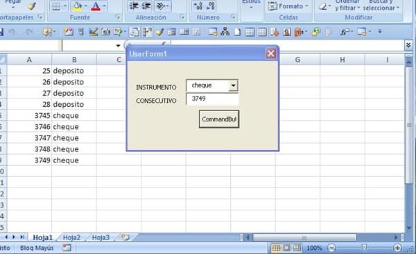 En la imagen puedes ver el resultado, en un combobox te muestra los instrumentos, seleccionas uno y en automático te carga el siguiente consecutivo en el ejemplo cargo el 3749 y al dar click en el botón lo pasa a la hoja