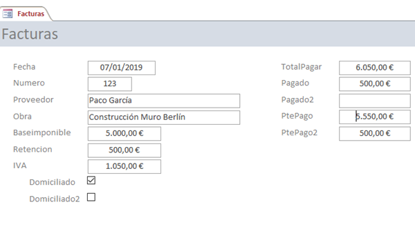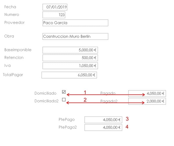 Tengo una base de datos basada en facturas donde tengo una tabla que contiene los campos de fecha, número, proveedor, obra, base imponible, retención, iva, total a pagar, pagado, pagado2, domiciliado, domiciliado2, pendiente de pago y pte de pago2 y mi problema es el siguiente, que una vez que registro una factura, me calcula el total a pagar y el pendiente de pago que en principio es igual al total a pagar y en el mismo registro puedo anotar el primer pago y un segundo pago si es que fracciono los pagos, el campo "domiciliado" y "domicilado2" son casillas de verificación para indicar que es un pago domiciliado con un vencimiento y quiero que si la casilla está activada, tanto "domiciliado" y "domiciliado2" (puede que ambas estén activadas o desactivadas o una activada y la otra no) que el campo "pte de pago2" me sume los importes de "pagado" y "pagado2" y que el campo "pte de pago" sea el resultado de restarle al campo "total a pagar", los importes de "pagado" y "pagado2" si éstos tienen la casilla de verificación desactivada.