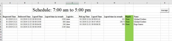 Agradezco la colaboración de ustedes expertos con esta duda, tengo una tabla en excel que es acumulativa entonces todos los días se le actualizan varias filas, sin embargo periódicamente yo ocupo sacar un promedio de la columna D "Lapsed Time in seconds" por así decirlo semanalmente, mi gran idea seria agregar un botón que puse en la columna K y que me saque el promedio al lado, ¿pero yo ocupo que ese macros me permita escoger el rango de celdas de la columna D a promediar? ¿No se si esto es posible o me pueden dar alguna sugerencia? Gracias de antemano compañeros!
