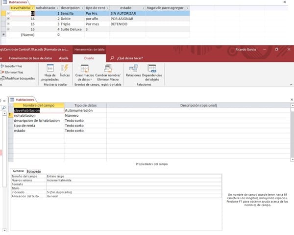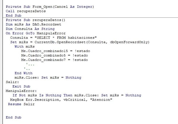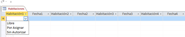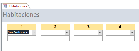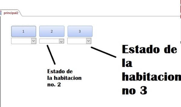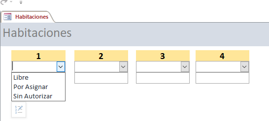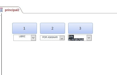 Tengo una bd. En Access, tengo una tabla habitaciones con un campo texto llamado Estado (3 posibles estados para cada una libre, por asignar, sin autorizar). Las cuales se dan de alta con la habitación (libre por default). Tengo un formulario con un botónes de comando que simulan graficamente cada numero de habitación de un hotel. Cada Habitación necesito que tenga un cuadro combinado que muestre los 3 posibles estados dados de alta en otra tabla llamada estados adjunto imagen de ejemplo.