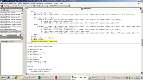 Option Compare Database Public cmbCategoria As New FindAsYouTypeCombo Public cmbCliente As New FindAsYouTypeCombo Public cmbAno As New FindAsYouTypeCombo Public cmbTrimestre As New FindAsYouTypeCombo Private Sub Form_Load() cmbCategoria.InitalizeFilterCombo Me.cc, "Categoría", FromBeginning, True, True cmbCliente.InitalizeFilterCombo Me.apcc, "Cliente", FromBeginning, True, True cmbAno.InitalizeFilterCombo Me.acc, "Año", FromBeginning, True, True cmbTrimestre.InitalizeFilterCombo Me.tcc, "Expr1", FromBeginning, True, True End Sub Private Sub Etiqueta30_Click() Dim MiApro As String Dim MiCategoría As String Dim MiAño As String Dim MiTrimestre As String Dim miFiltro As String Dim MiArgumento As String Dim MisOpciones As String miFiltro = "" 'Inicializamos el filtro If Me.Apro.Value <> 1 Then If IsNull(Me.apcc.Value) Then MsgBox "Debe seleccionar el proveedor", vbCritical, "ERROR" Exit Sub End If MiApro = Me.apcc.Value miFiltro = miFiltro & " AND " & "[Código2]='" & MiApro & "'" End If If Me.Categoría.Value <> 1 Then If IsNull(Me.cc.Value) Then MsgBox "Debe seleccionar la categoría", vbCritical, "ERROR" Exit Sub End If MiCategoría = Me.cc.Value miFiltro = miFiltro & " AND " & "[Código1]='" & MiCategoría & "'" End If If Me.Año.Value <> 1 Then If IsNull(Me.acc.Value) Then MsgBox "Debe seleccionar el año", vbCritical, "ERROR" Exit Sub End If MiAño = Me.acc.Value miFiltro = miFiltro & " AND " & "[Año]='" & MiAño & "'" End If If Me.Trimestre.Value <> 1 Then If IsNull(Me.tcc.Value) Then MsgBox "Debe seleccionar el trimestre", vbCritical, "ERROR" Exit Sub End If MiTrimestre = Me.tcc.Value miFiltro = miFiltro & " AND " & "[Trimestre]='" & MiTrimestre & "'" End If '------------ CAPTION DEL INFORME ----------------------------------------- MiArgumento = " - " If Me.Año.Value = 2 Then MiArgumento = MiArgumento & Me.acc & " " MisOpciones = MisOpciones & "a" End If If Me.Trimestre.Value = 2 Then MiArgumento = MiArgumento & "T" & Me.tcc & " " MisOpciones = MisOpciones & "t" End If If Me.Categoría.Value = 2 Then MiArgumento = MiArgumento & DLookup("Categoría", "01-A Categorías", "[Código de la categoría]='" & Me.cc.Value & "'") & " " MisOpciones = MisOpciones & "c" End If If Me.Apro.Value = 2 Then If Me.Categoría.Value = 2 Then MiArgumento = MiArgumento & "/ " & DLookup("Cliente", "01-B Clientes", "ID_Cliente='" & Me.apcc.Value & "'") & " " Else MiArgumento = MiArgumento & DLookup("Cliente", "01-B Clientes", "ID_Cliente='" & Me.apcc.Value & "'") & " " End If MisOpciones = MisOpciones & "p" End If MiArgumento = MiArgumento & MisOpciones & Len(MisOpciones) '--------------------------------------------------------------------------- If Len(miFiltro) > 0 Then miFiltro = Right(miFiltro, Len(miFiltro) - 4) End If If miFiltro = "" Then DoCmd.OpenReport "04-A Ingresos", acViewPreview Else DoCmd.OpenReport "04-A Ingresos", acViewPreview, , miFiltro, , MiArgumento End If DoCmd.Close acForm, Me.Name End Sub Private Sub Categoría_AfterUpdate() Select Case Me.Categoría.Value Case 1 Me.cc.Visible = False Case 2 Me.cc.Visible = True End Select Me.cc.Value = "" End Sub Private Sub cc_AfterUpdate() Me.apcc.Value = "" Me.apcc.Requery Me.apcc.Visible = False Me.Apro.Value = 1 Me.acc.Value = "" Me.acc.Requery Me.acc.Visible = False Me.Año.Value = 1 Me.tcc.Value = "" Me.tcc.Requery Me.tcc.Visible = False Me.Trimestre.Value = 1 End Sub Private Sub Apro_AfterUpdate() Dim miRowSce As String If Me.Apro = 1 Then Me.apcc.Visible = False Else Me.apcc.Visible = True Me.apcc = Null 'No es necesario, pero si haces pruebas a lo loco agradecerás que te vaya borrando el valor seleccionado. If Me.Categoría = 1 Then miRowSce = "SELECT [02- Diálogo IVA repercutido].Cliente, [02- Diálogo IVA repercutido].ID_Cliente" _ & " FROM [02- Diálogo IVA repercutido]" _ & " GROUP BY [02- Diálogo IVA repercutido].Cliente, [02- Diálogo IVA repercutido].ID_Cliente" Else miRowSce = "SELECT [02- Diálogo IVA repercutido].Cliente, [02- Diálogo IVA repercutido].ID_Cliente, [02- Diálogo IVA repercutido].[Código de la categoría]" _ & " FROM [02- Diálogo IVA repercutido]" _ & " GROUP BY [02- Diálogo IVA repercutido].Cliente, [02- Diálogo IVA repercutido].Id_Cliente," _ & " [02- Diálogo IVA repercutido].[Código de la categoría]" _ & " HAVING ((([02- Diálogo IVA repercutido].[Código de la categoría])=[Forms].[03-E Dialogo IVA repercutido (Clientes)].[cc].[value]))" End If End If Me.apcc.RowSource = miRowSce Me.apcc.Requery cmbCliente.RowSource = miRowSce End Sub Private Sub apcc_AfterUpdate() Me.acc.Value = "" Me.acc.Requery Me.acc.Visible = False Me.Año.Value = 1 Me.tcc.Value = "" Me.tcc.Requery Me.tcc.Visible = False Me.Trimestre.Value = 1 End Sub Private Sub Año_AfterUpdate() Dim miRowSce As String If Me.Año = 1 Then Me.acc.Visible = False Else Me.acc.Visible = True Me.acc = Null 'No es necesario, pero si haces pruebas a lo loco agradecerás que te vaya borrando el valor seleccionado. If Me.Categoría = 1 And Me.Apro = 1 Then miRowSce = "SELECT Year([Fecha de la factura]) AS Año " _ & "FROM [01-E Compras] " _ & " GROUP BY Year([Fecha de la factura]);" End If If Me.Categoría = 2 And Me.Apro = 1 Then miRowSce = "SELECT Year([Fecha de la factura]) AS Año, [01-E Compras].Código " _ & "FROM [01-E Compras]" _ & "GROUP BY Year([Fecha de la factura]), [01-E Compras].Código" _ & " HAVING ((([01-E Compras].Código)=[Forms].[03-E Dialogo IVA repercutido (Clientes)].[cc].[Value]));" End If If Me.Categoría = 1 And Me.Apro = 2 Then miRowSce = "SELECT Year([Fecha de la factura]) AS Año, [01-E Compras].ID_Cliente " _ & "FROM [01-E Compras]" _ & "GROUP BY Year([Fecha de la factura]), [01-E Compras].ID_Cliente" _ & " HAVING ((([01-E Compras].ID_Cliente)=[Forms].[03-E Dialogo IVA repercutido (Clientes)].[apcc].[value]));" End If If Me.Categoría = 2 And Me.Apro = 2 Then miRowSce = "SELECT Year([Fecha de la factura]) AS Año, [01-E Compras].ID_Cliente, [01-E Compras].Código " _ & "FROM [01-E Compras]" _ & "GROUP BY Year([Fecha