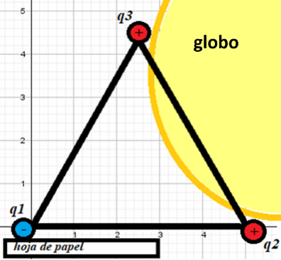 Un globo electrostáticamente cargado ejerce una fuerza de atracción sobre un papel de tal forma que se pueden identificar dos cargas positivas en la periferia del globo y una negativa en la periferia del papel. Las cargas del globo y del papel están colocadas en los vértices de un triángulo equilátero cuyos lados tienen una longitud de 5 cm, tal como se muestra en la figura. Se sabe que la carga q1 tiene polaridad negativa con un valor de 20 μC (microcoulomb), la carga q2 tiene polaridad positiva con una magnitud de 10 μC y la carga q3 también tiene polaridad positiva con una intensidad de 30 μC.