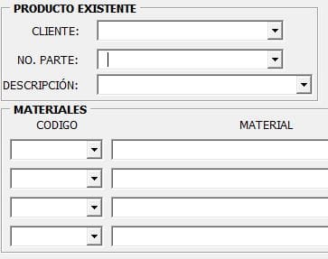 2.- Producto (2 combobox relacionados: código, descripción de material con nombres NPARTEXISTENTE, PROD)