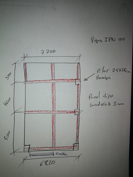 Lo que tengo en mente hacer es picar el bloque para montar dos pilares donde ahora descansan las vigas, no tengo claro si hacerlo de hormigón o de viga IPN. Después a las vigas existentes a lo ancho soldarle por abajo otra IPN de 100 previo apuntalado para quitarle la flecha.