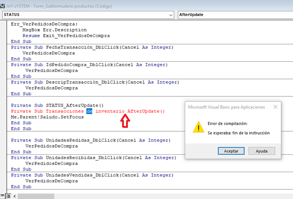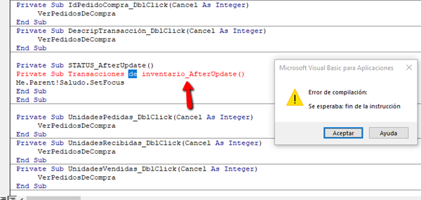 Me da un error en la 1ra línea donde escribo el nombre de subformulario, puse con guion bajo y sin, y lo mismo... ¿qué estaré haciendo mal?