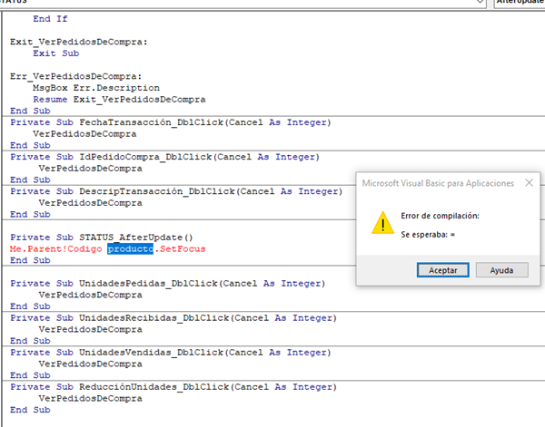cuando escribo el nombre del campo (Codigo de producto) donde tendría que ir, me tira este error