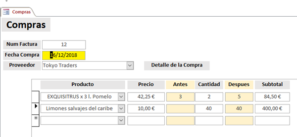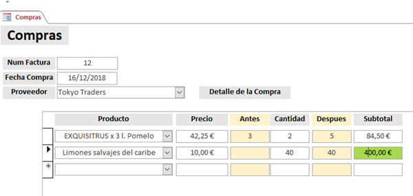 Puedes ver, que el cuadro de texto Subtotal ya no tiene el foco y se ha ido al control FechaCompra se ha puesto en amarillo)