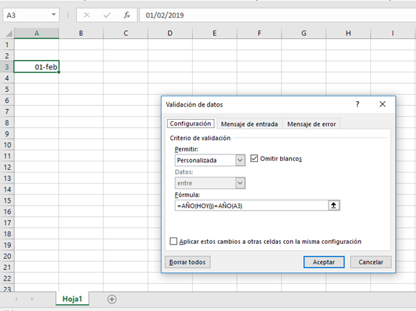 Como debo validar una celda para que solo acepte fechas del año en curso, es decir que si estoy en 2019, solo acepte fechas entre 01/01/2019 y el 31/12/2019, pero que al cambiar de año es decir a 2020, y de acuerdo a la fecha del sistema (año en curso), la celda solo acepte fechas del año en curso