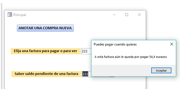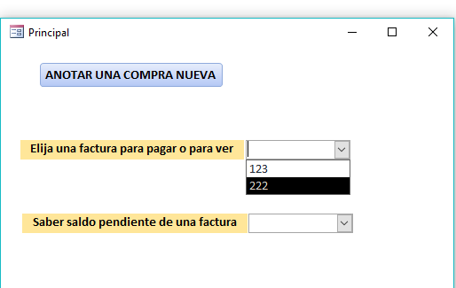 ¿Qué en un determinado momento quiero saber lo que me falta por pagar de una factura? En el formulario Principal, en el combinado de abajo, elijo una, en este caso la 222, ya que no he rellenado más,