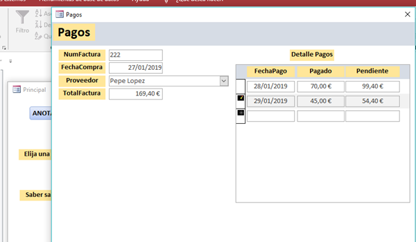 Se abre el formulario Pagos(con origen en la tabla Compras, ya que lo que tengo que ir pagando es una Compra). En el subformulario anoto la fecha, lo que pago y en Pendiente me pone la cantidad que me queda por pagar de esa factura.