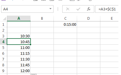 La presente es para solicitarles nuevamente ayuda, resulta que tengo la siguiente imagen. Como podran observar en la celda A1 está las 10:30 a.m., lo que necesito es que al arrastrar dicha hora esta se vaya incrementando cada 15 minutos, ejemplo 10:45 a.m, 11:00 a.m, etc.