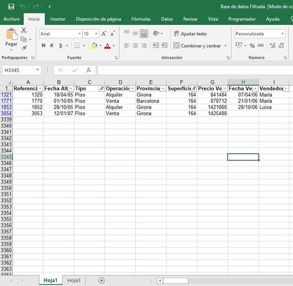 Vemos que tenemos dos filtros aplicados sobre columna C y F el cual nos da en este caso 4 filas de datos, me gustaría pasar ciertos datos de cada fila, pero en diferentes hojas.