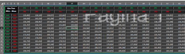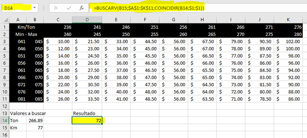 Tengo una tabla con varias filas y columnas, en las filas 3 y 5 tengo unos rangos de toneladas, en las columnas C y E tengo unos rangos de Kilómetros, las demás columnas de la H hasta la BX tengo un rango de precios, necesito que vaya a una hoja donde tengo mis Kilómetros recorridos en el mes, por ejemplo 81,975