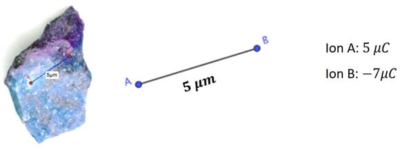 Adriana encontró un cristal precioso. En el laboratorio de mineralogía se determina que el cristal está compuesto por dos iones, los cuales se encuentran a una distancia de 5 μm ( 5 × 10-6 m ), con cargas de 5 μC y -7μC, como se muestra en la figura.